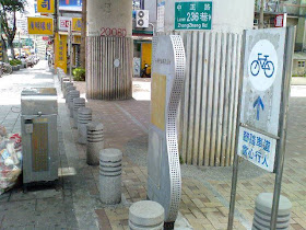 若要談行人用路之權益,此處的頭號大患除了經常佔用騎樓擺貨的那個商店之外,就是市政府自己啊!交通局、環保局、公園路燈管理處各行其是,缺乏協調,才會在不到一平方公尺大的空間內設置那麼多設施來檔路。樂團裡面各吹各號,問題當然出在拿指揮棒的那一個人。