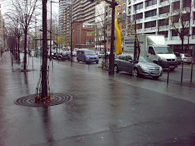 圖13 攝於中山北路五段,當時適逢雨天。此處沒有舊式爛紅磚,再加上地面向馬路稍斜的設計,行人基本上並不會碰到被污水噴髒鞋面的問題。在這樣的路面,嬰兒車、 菜籃車、行李箱的行進也比在地磚鋪面上容易,較不會出現顛簸。就整體視覺與使用方便性而言,這樣的路面並不比我們先前看過的巴黎街道差。