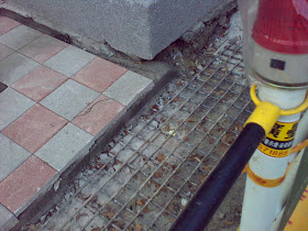 圖 22是這一段人行道在2008年10月重鋪時的景象。2005馬市長時代所做的路樹基座水泥連帶也被除去;在鋪完地磚後,市府又重做一次水泥構造。由於查 看公車站牌者的需要仍未被照顧到,想拍攝到圖21那般場景的人還是有機會的喔(苦笑)。當然囉,中正路兩側路樹還是跟馬英九時代一樣,一邊有隆起的基座, 另一邊沒有。